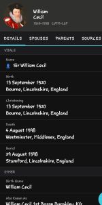 William was married two times, and some sources say three, the first was to Mary Cheke (my 14th great grandmother), they had one son, Thomas Cecil. William had six children by his second wife Mildred Cooke. William served as Prime Minister of England under Queen Elizabeth the First for forty years and was made Lord Burghley in 1571.