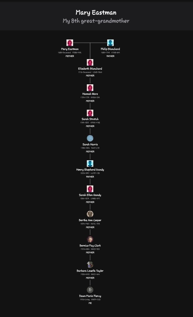 After Mary’s husband Philip passed away in 1720, records and source indexes show that Mary Blanchard (Eastman) went back to London, England where she died in September of 1727 and was buried 14, September 1727 in London, England. This is what I have uncovered so far via source indexing. When I find out more information via indexing, I will add and adjust as needed, if needed. Most of their descendants moved westward in time, with many scattered across the Midwest, and various parts across the entirety of the United States of America.