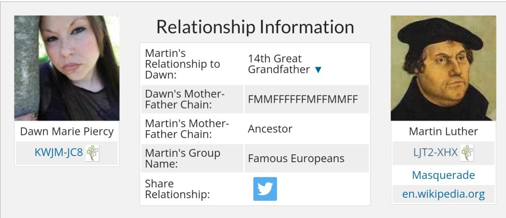 Katharina von Bora born, 29 January 1499 – died 20 December 1552), after her wedding, Katharina Luther, also referred to as ‘die Lutherin’ (‘the Lutheress’), was the wife of the German reformer Martin Luther and a seminal figure of the Protestant Reformation. Although little is known about her, she is often considered to have been important to the Reformation, her marriage setting a precedent for Protestant family life and clerical marriage. This is the information on our family tree left by my 9th cousin. (Keeping name private)